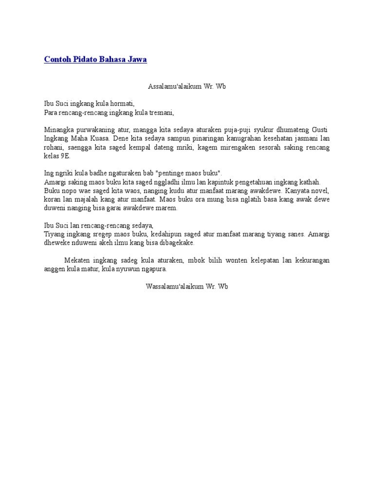 Contoh Pidato Bahasa Jawa Tentang Sekolah Assalamualaikum Wr. Pidato bahasa Jawa atau disebut juga dengan Sesorah dalam bahasa Indonesia berarti menyampaikan sebuah gagasan ataupun informasi dengan menyampaikannya di depan banyak orang untuk tujuan tertentuSama halnya dengan pidato berbahasa Indonesia inti dari sesorah juga banyak kesamaannya yang berbeda hanyalah bahasa sesorah yang menggunakan bahasa. Pidato bahasa Jawa atau disebut juga dengan Sesorah dalam bahasa Indonesia berarti menyampaikan sebuah gagasan ataupun informasi dengan menyampaikannya di depan banyak orang untuk tujuan tertentuSama halnya dengan pidato berbahasa Indonesia inti dari sesorah juga banyak kesamaannya yang berbeda hanyalah bahasa sesorah yang menggunakan bahasa JawaSesorah.