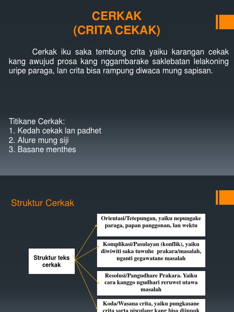 Tegese cerkak yaiku. 1 pangenalan eksposisi 2 panantangankonflik 3 klimaks. Struktur Crita Cerkak ono 2 macem yaiku Unsur instrinsik lan ekstrinsik-Unsur Intrinsik Cerkak 1Tema yaiku gagasan utawa idhe sing dadi underane crita bisa dititik langsung saka ukara-ukara ing teks utawa dijupuk saka inti critane. Kamus Besar Bahasa Indonesia KBBI Cerita tegese tuturan sing dijlentheraken kepriwe kedadeyane sawijining babmasalah dene cekak tegese ora dawa kurang sekang.