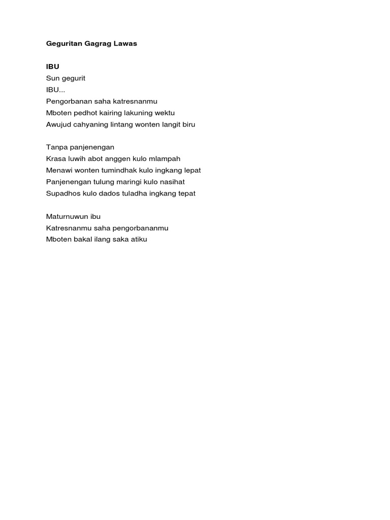 Geguritan gagrag lawas geguritan tradisional iku darbe paugeran mangkene. Sinten kemawon saged ndamel geguritan. Jika kamu sedang mencari referensi geguritan atau puisi bahasa jawa berikut kumpulan contoh geguritan puisi bahasa jawa seperti dirangkum dari romadecade dan padukata.