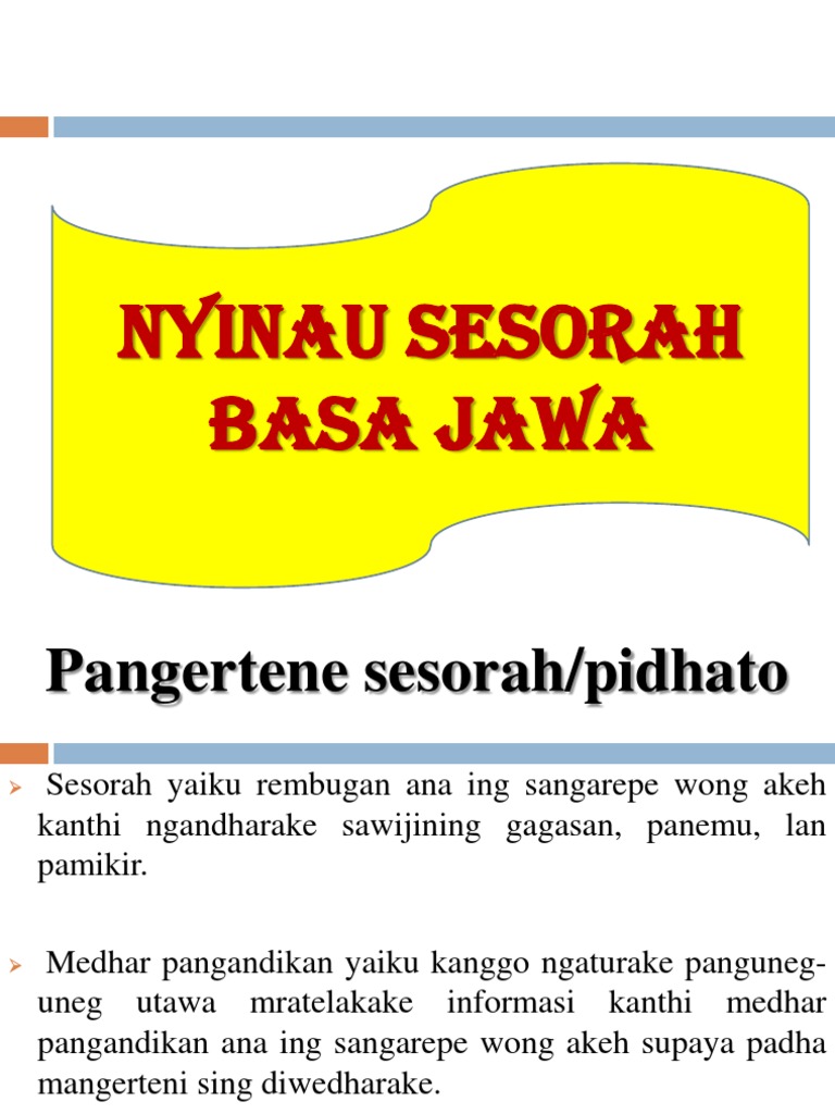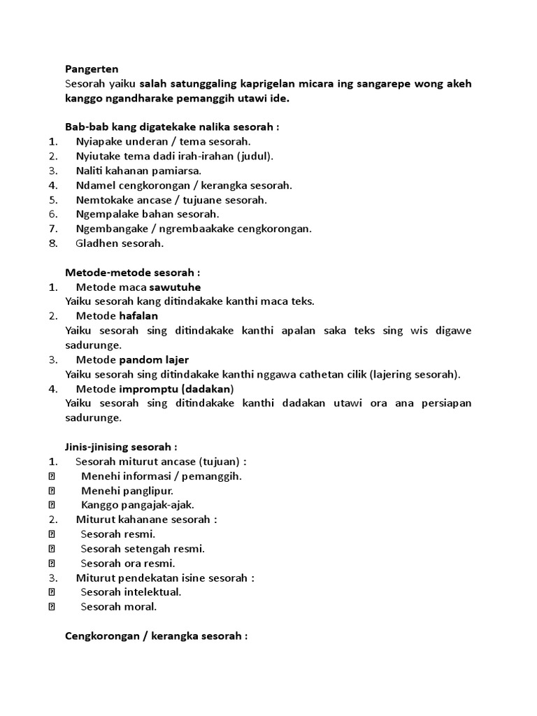 SESORAH yaiku rembugan ana ing sangarepe wong akeh kanthi ngandharake sawijining gagasan panemu pamikir lan sapanunggalane. Sesorah Kelas XI semester 1 1Pangerten Sesorah yaiku micara gagasan utawa panemu sarana lisan ana ngarepe wong akeh. Kesimpulan Ancase utawa Tujuane sesorah iku ana 5.