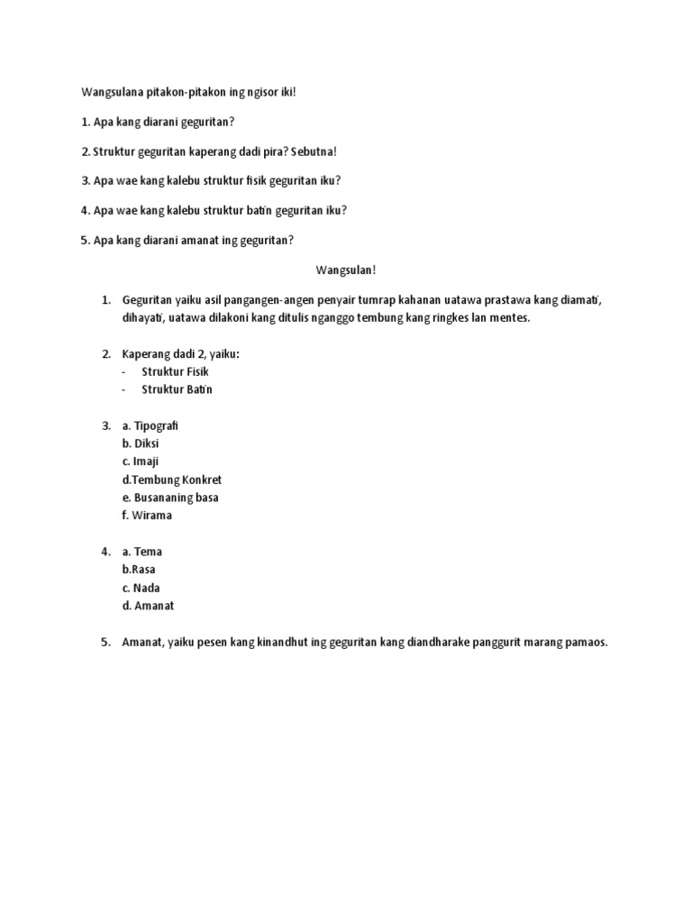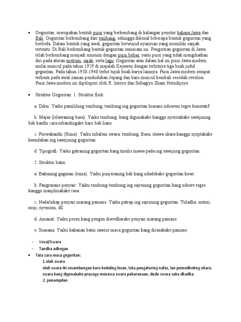 Gandheng geguritan kuwi kalebu puisi jawa sing isih anyar antarane tahun 1926 jinising puisi iki durung bisa katampa bebrayan ana ing masyarakat rikala semono. 5800000 Tunjangan kesehatan Rp. GEGURITAN Geguritan yaiku salah sijining karya sastra jawa ingkang kawujud saking rasa ing ati kang diungkapaken kaliyan penyair ngagem bahasa ingkang gadah irama rima mitra bait lan penyusan lirik kang gadah arti utawa makna wonten ing lirik geguritan.