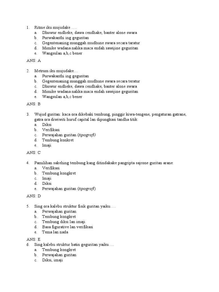 Kadadean saka 2 ukaragatra 2. Diksi iku dudu mung pamilihe tembung kang dianggo ing geguritan iku nanging uga perkara frasaologi lan gaya bahasa. Itulah yang dapat admin kumpulkan terkait struktur geguritan iku ana loro yaiku.