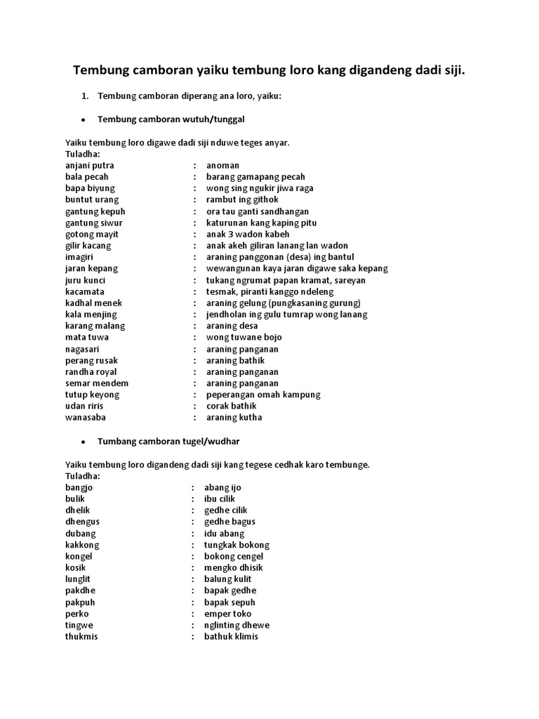Camboran wutuhlanang wadongedhe cilikbakul kacangedi penigagah prakosapamong desa. Bentuk bentuk tembung camboran tugel antara lain. Camboran tugelbangjo abang ijo.