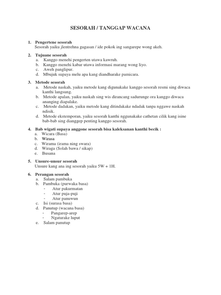 Sesorah utawa pidhato utawa tanggap wacana yakuwi njlentrehaké idhe utawa pokok pikiran kanthi wujud tembung- tembung kang diucapaké marang wong akéh. B Jawa Babagan Sesorah DRAFT. Urut-urutane sesorah teng ngandhap ingkang leres yaiku.