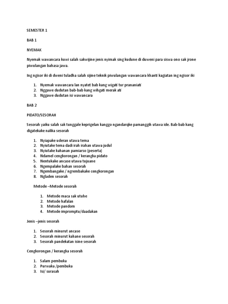Sesorah Kelas XI semester 1 1Pangerten Sesorah yaiku micara gagasan utawa panemu sarana lisan ana ngarepe wong akeh. Nyiyutake tema dadi irah-irahan judhul. Yaiku sesorah sing ditindakake kanthi apalan saka teks sing wis digawe sadurunge.