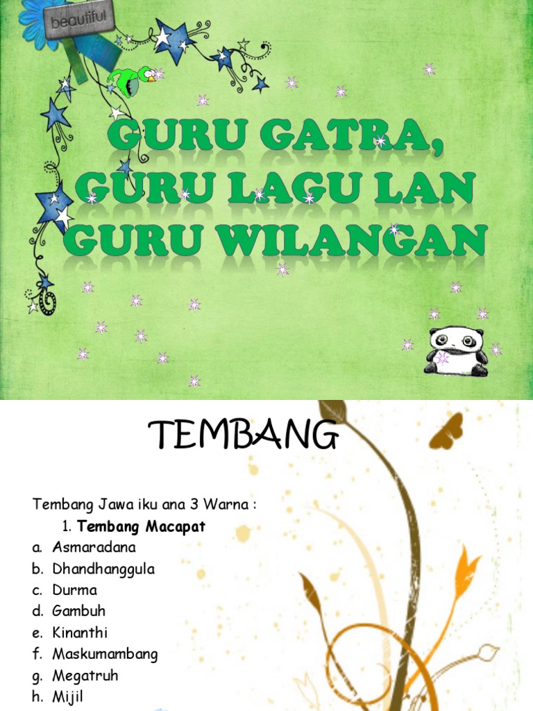 TEMBANG MACAPAT Tembang macapat yaiku tembang utawa puisi gagrag lawas kanthi paugeran - paugeran tartamtu kaya dene guru gatra guru wilangan lan guru lagu. 12 rows Guru gatra yaiku cacahe larikgatra saben pada bait. 8Watake tembang pangkur yaiku.