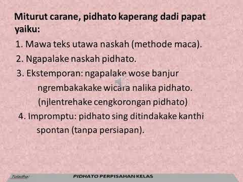 Video ini berisi contoh pidato berbahasa jawa sesorah yang digunakan untuk menghormati tamu ucapan selamat datang dalam prosesi upacara adat jawa. Sesorah ketua panitia sesorah pamangku gati sing duwe acara manten sunatan lsp Tanggap wacana. Panatacara menika salah satunggaling tiyangparaga ingkang gadhah jejibahan nglantaraken titilaksana satunggaling upacara kayata.